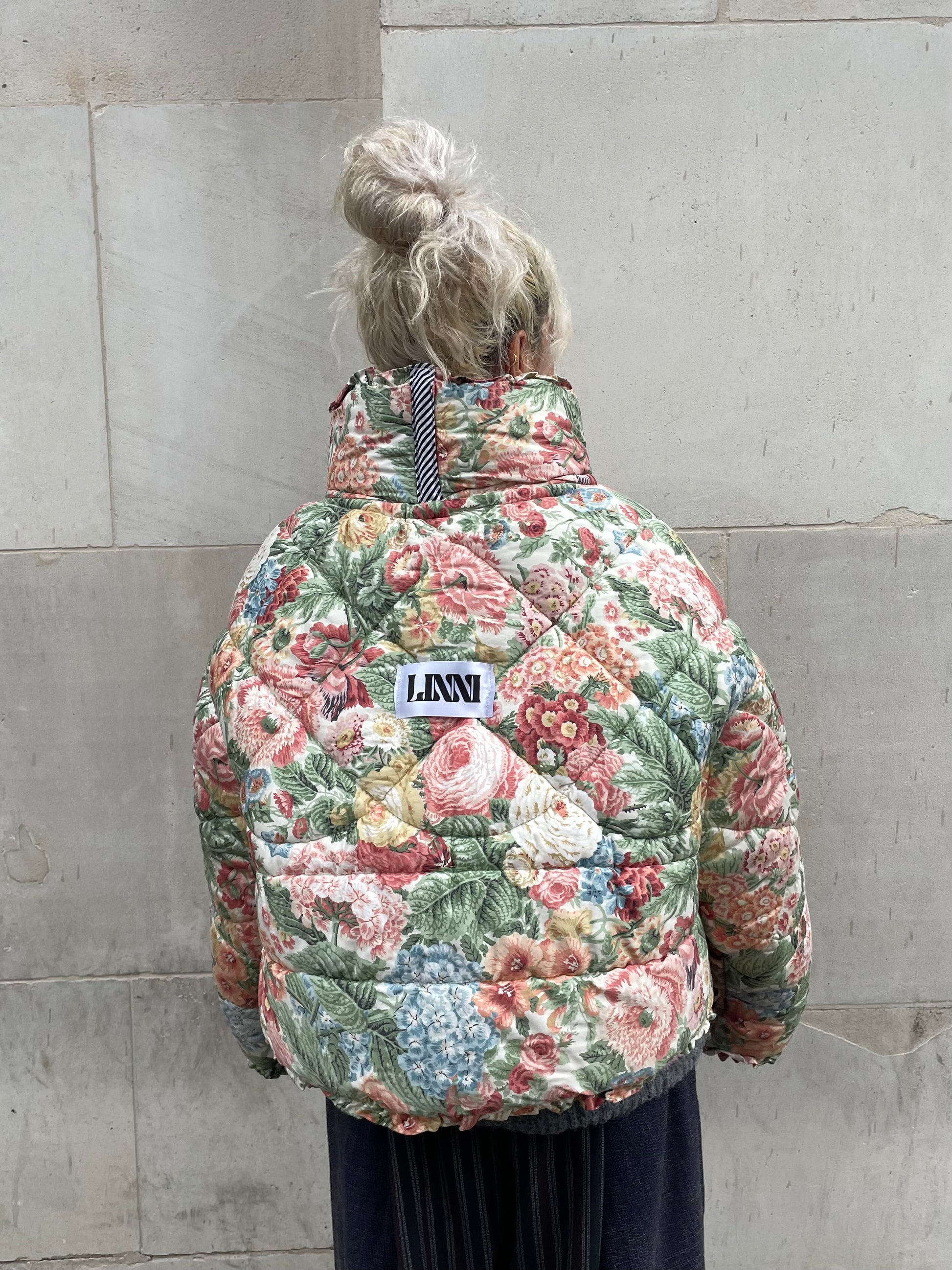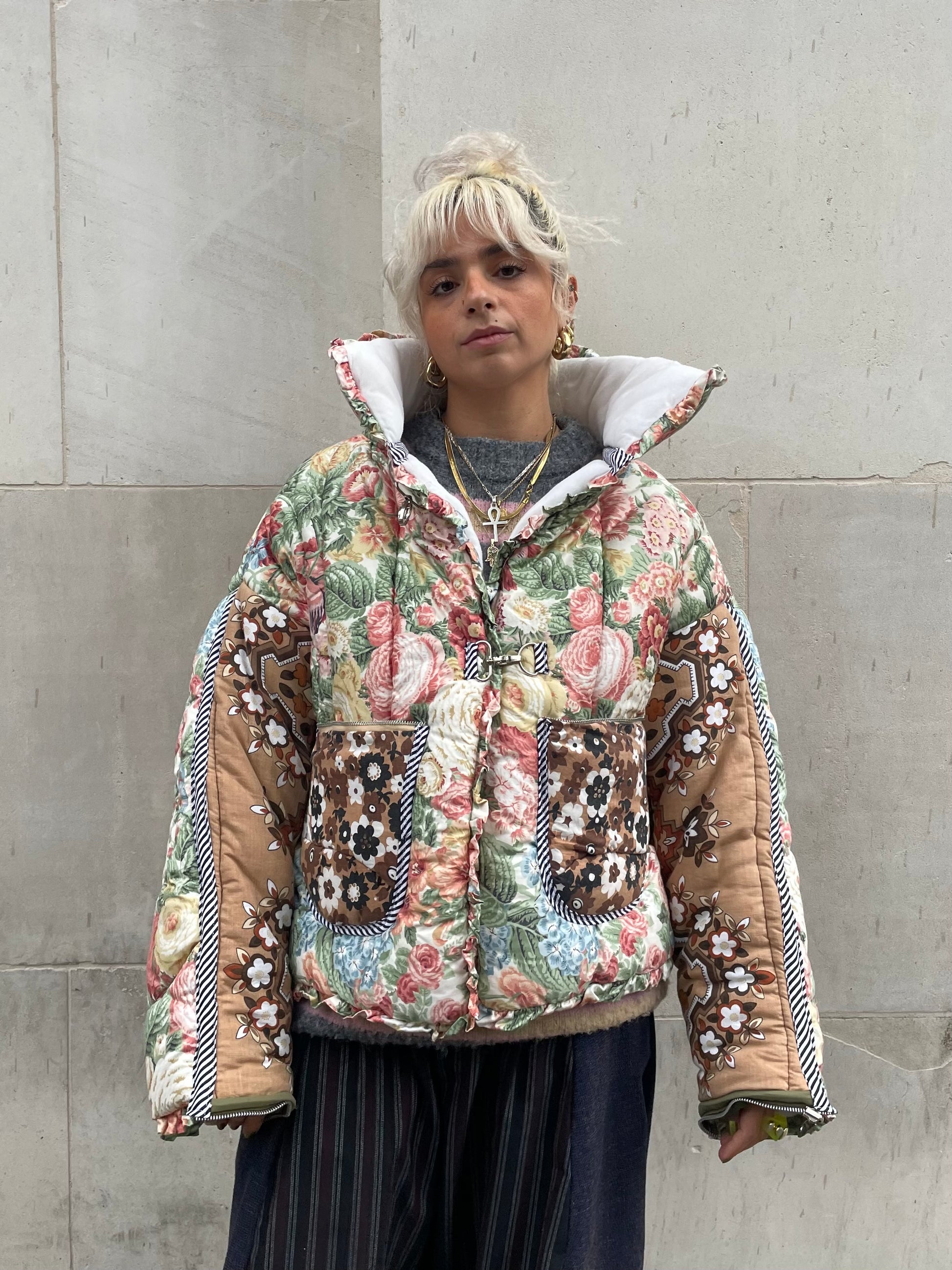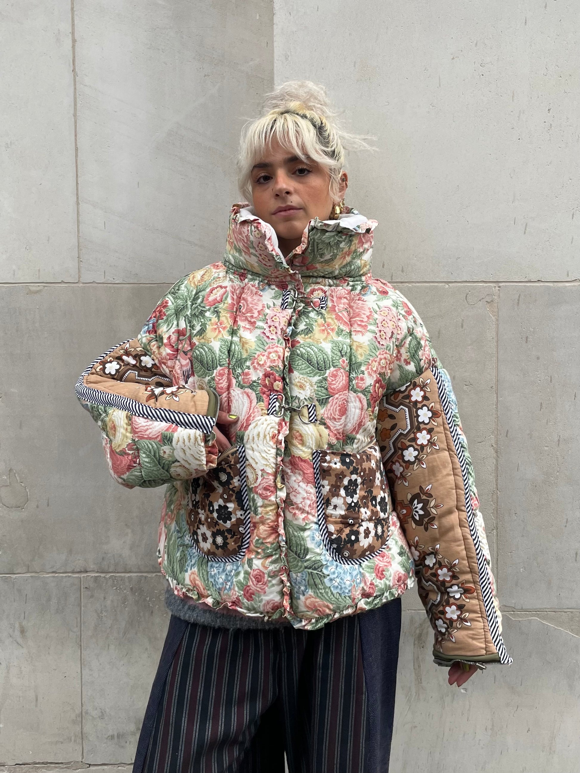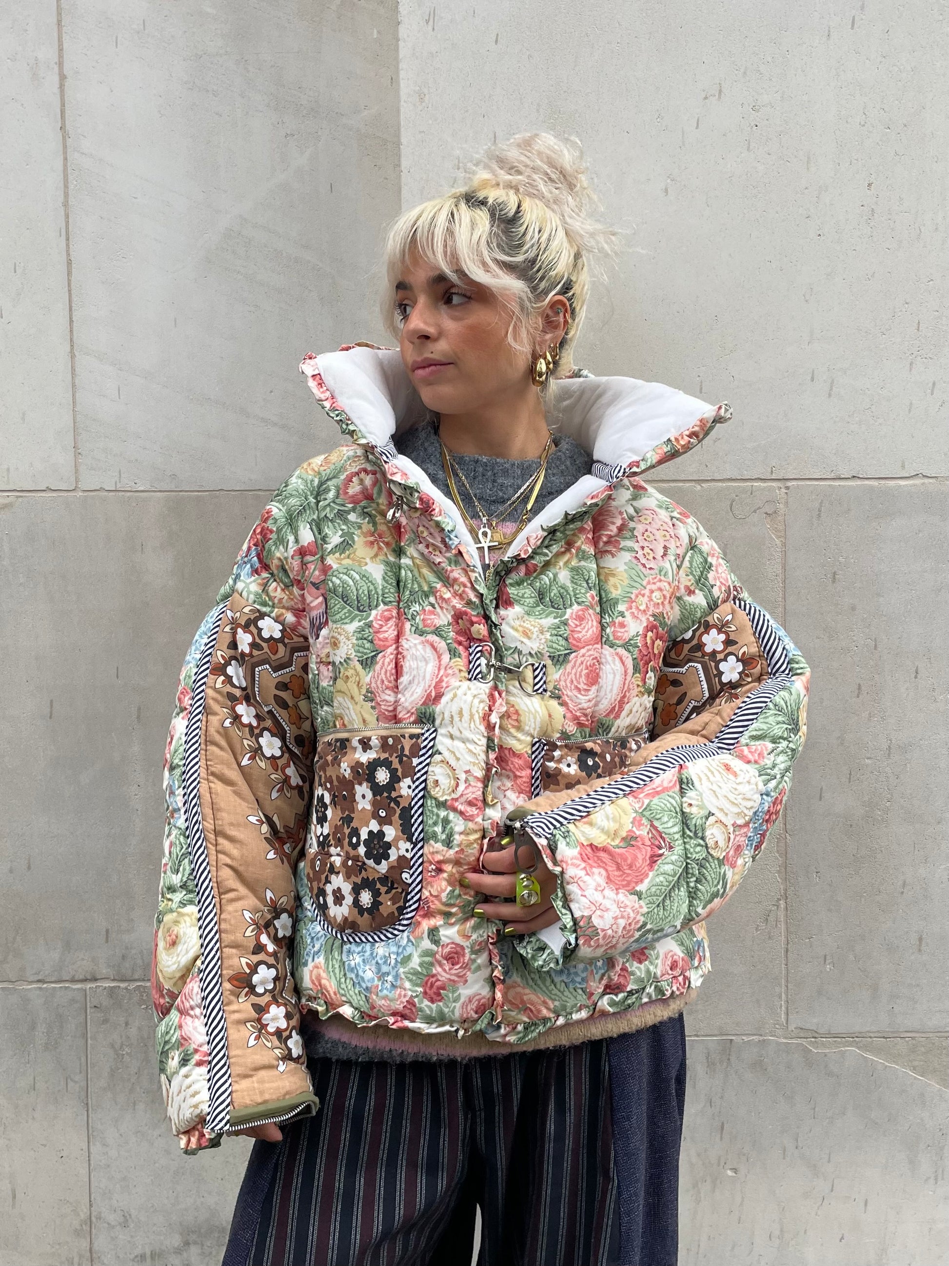 Handmade in London, this Upcycled Puffer Jacket is crafted from vintage duvets, bedspreads, and sleeping bags. Each piece is one-of-a-kind, designed for bold self-expression while being sustainable and environmentally responsible.