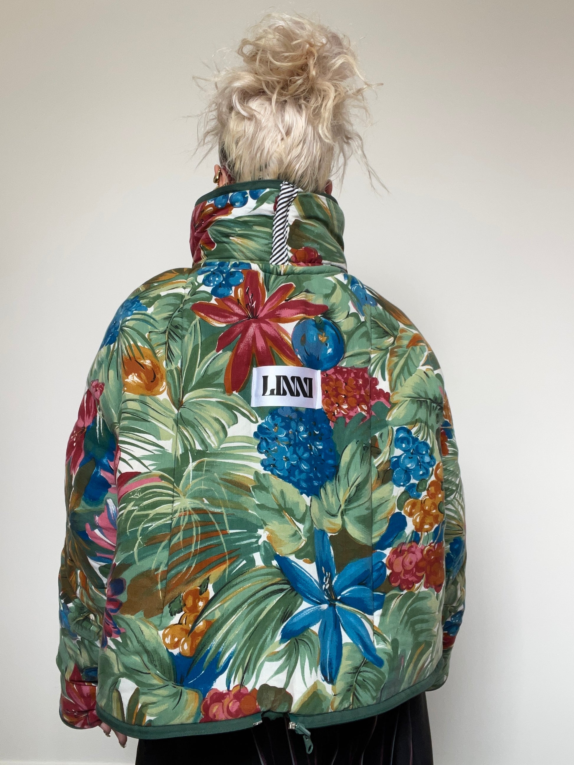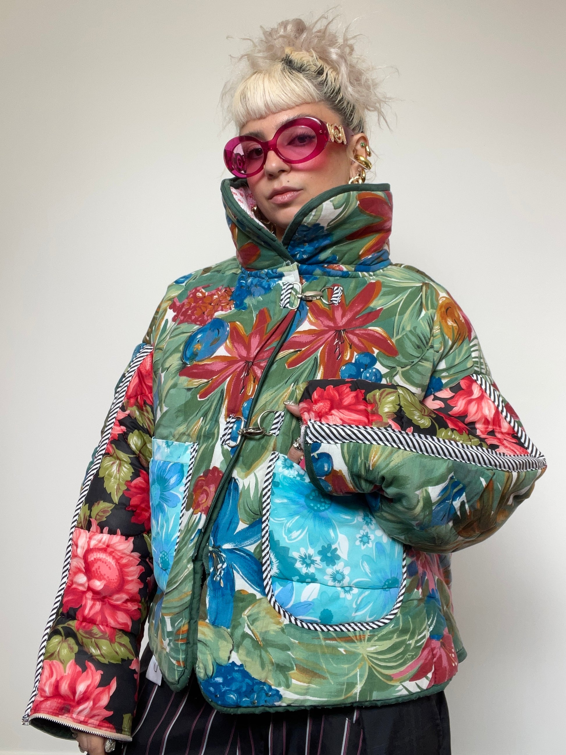 Upcycled Puffer Jacket in Green and Blue Florals